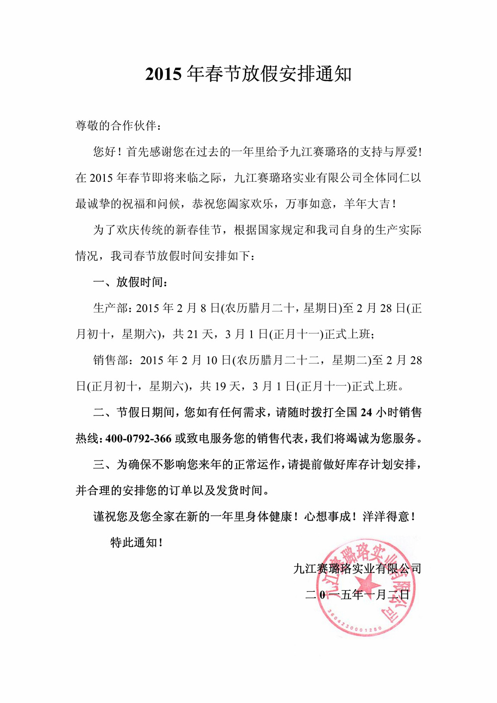 二、節(jié)假日期間,您如有任何需求,請隨時撥打全國24小時銷售熱線:400-0792-366或致電服務(wù)您的銷售代表,我們將竭誠為您服務(wù)。