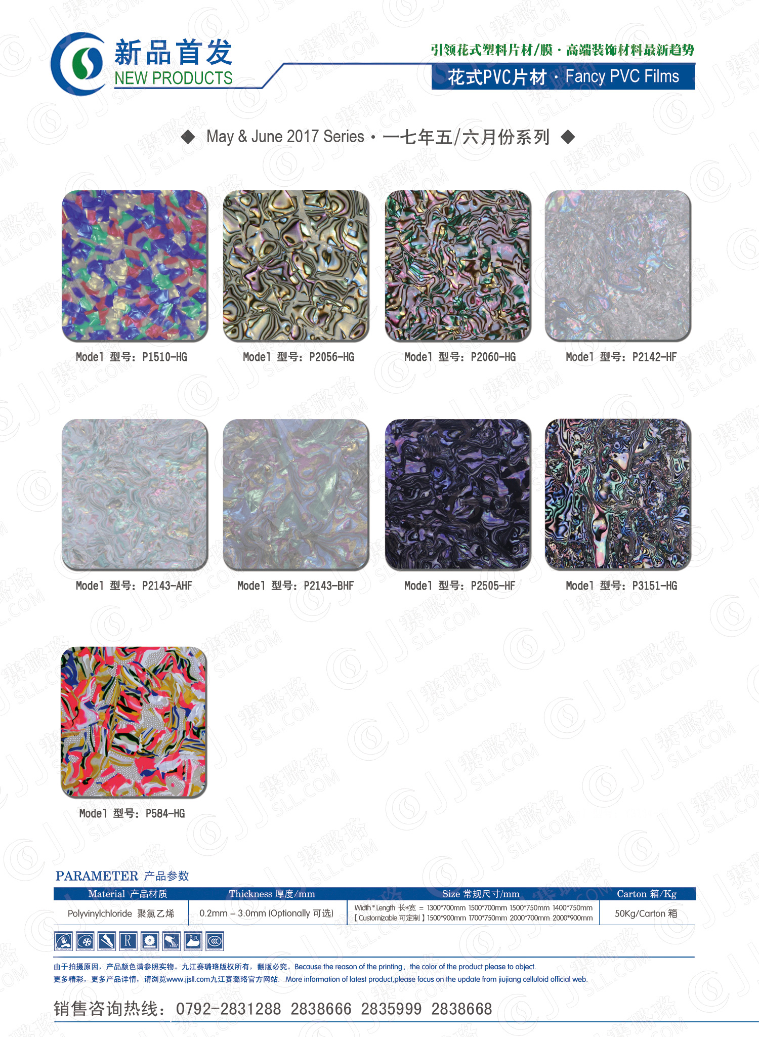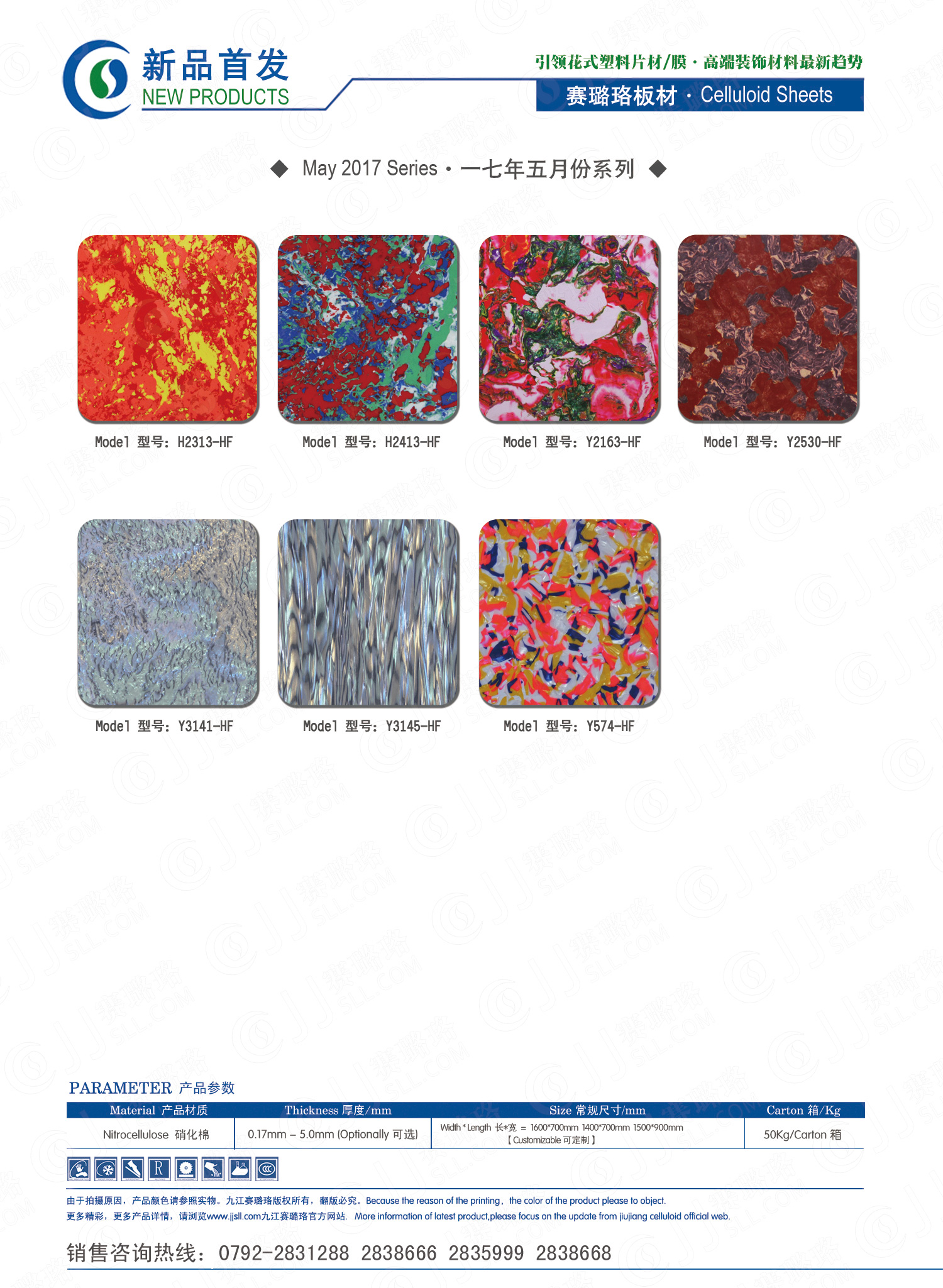 九江賽璐珞實業有限公司2017年五月及六月份賽璐珞板材、瑪瑙膜、理石膜、樂器裝飾材料、花式PVC片材新品發布,花式塑料片材/膜·多彩裝飾材料先驅者。咨詢熱線:0792-2838668 / 2831288 / 2838666 / 2835999。點擊圖片查看詳細產品